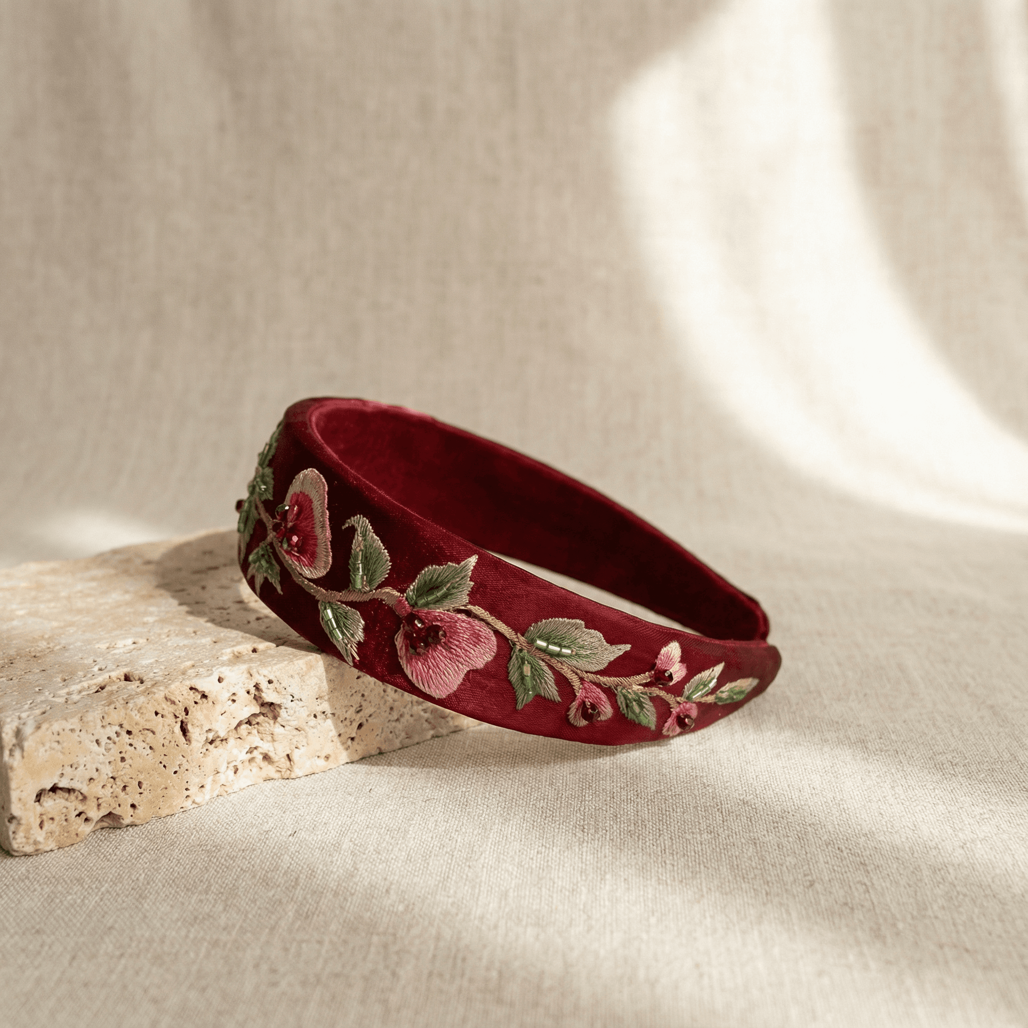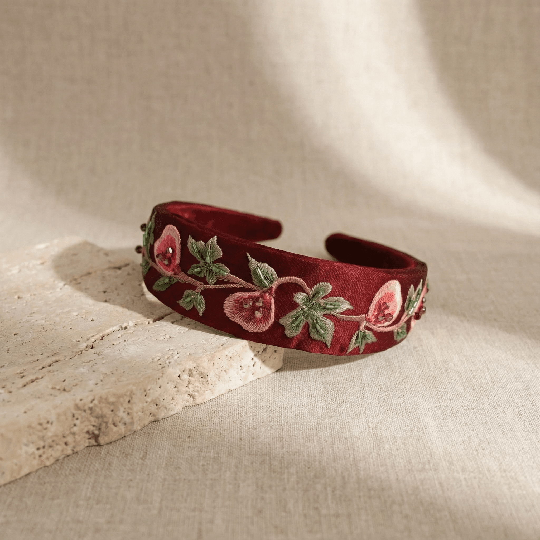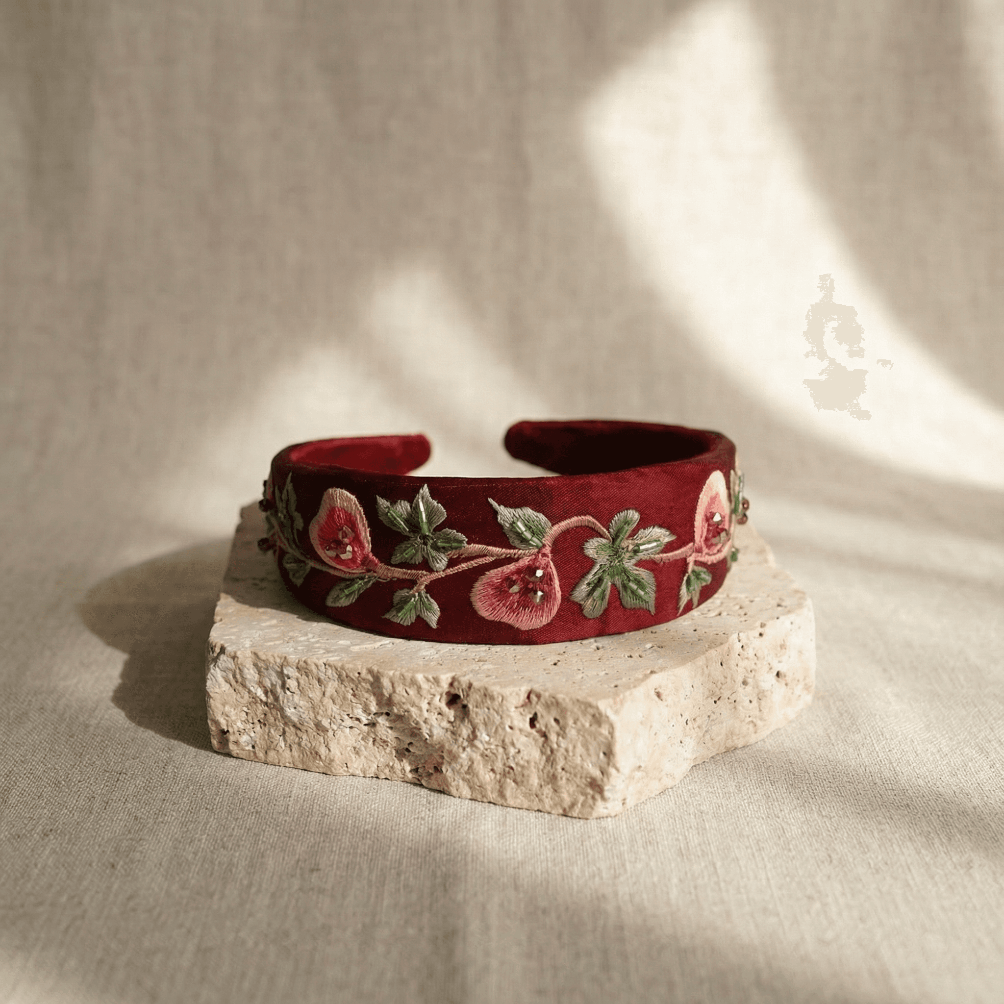 This headband translates the elegance of the fig tree into refined embroidery, bringing forward its symbolism of abundance, heritage, and rooted identity.