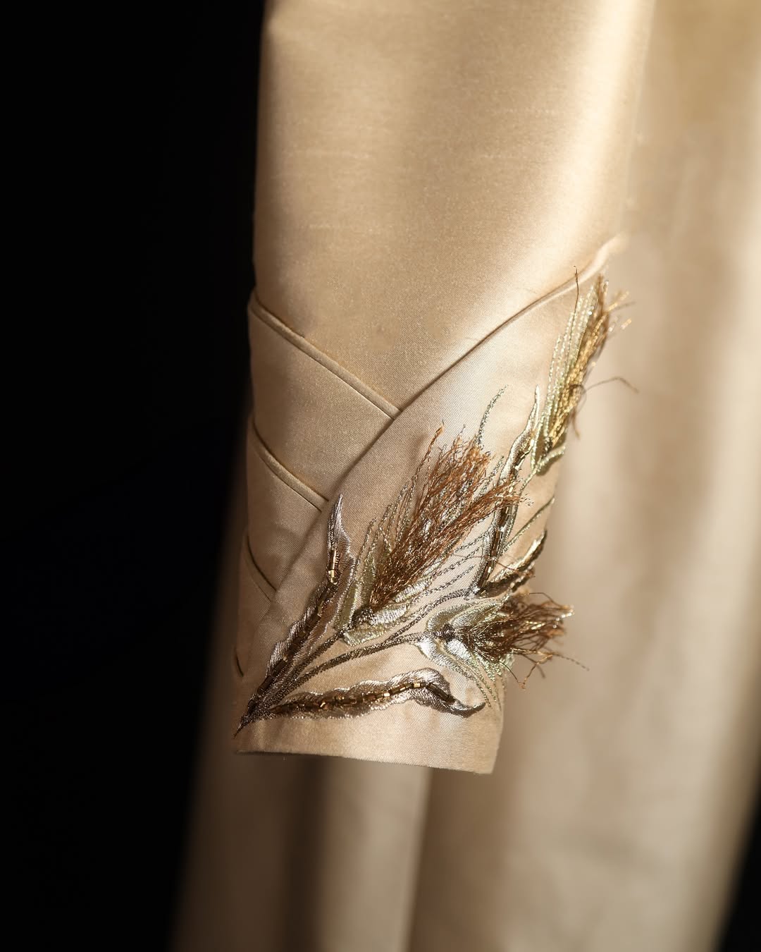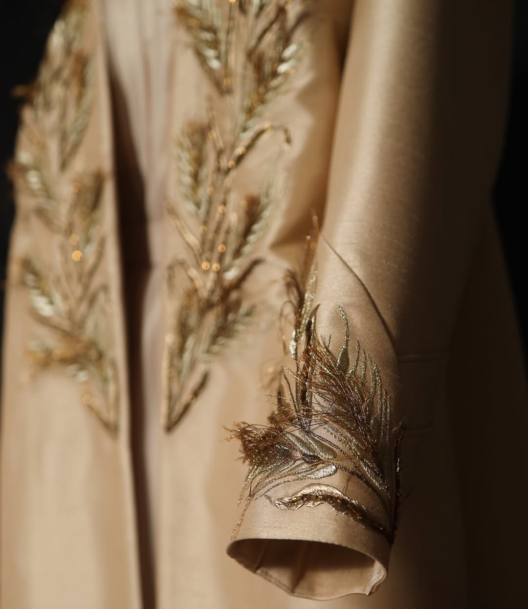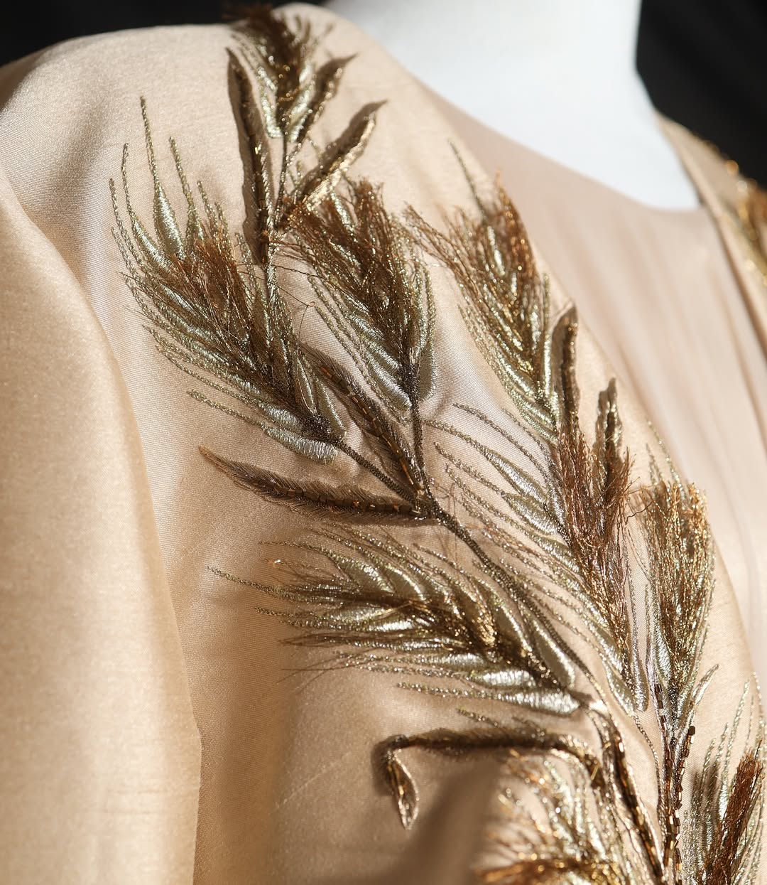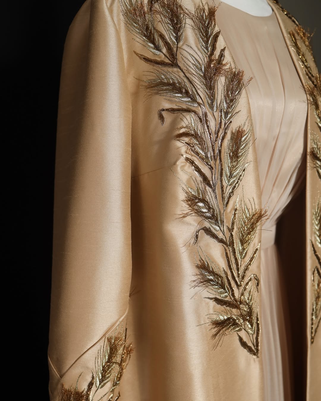 A golden silk abaya inspired by the wheat fields of the Arab world, symbolizing abundance and resilience. Featuring a plissé chiffon inner dress and hand-embroidered 3D wheat motifs in metallic threads and beadwork, it blends structure and fluidity in a timeless homage to Arab heritage.