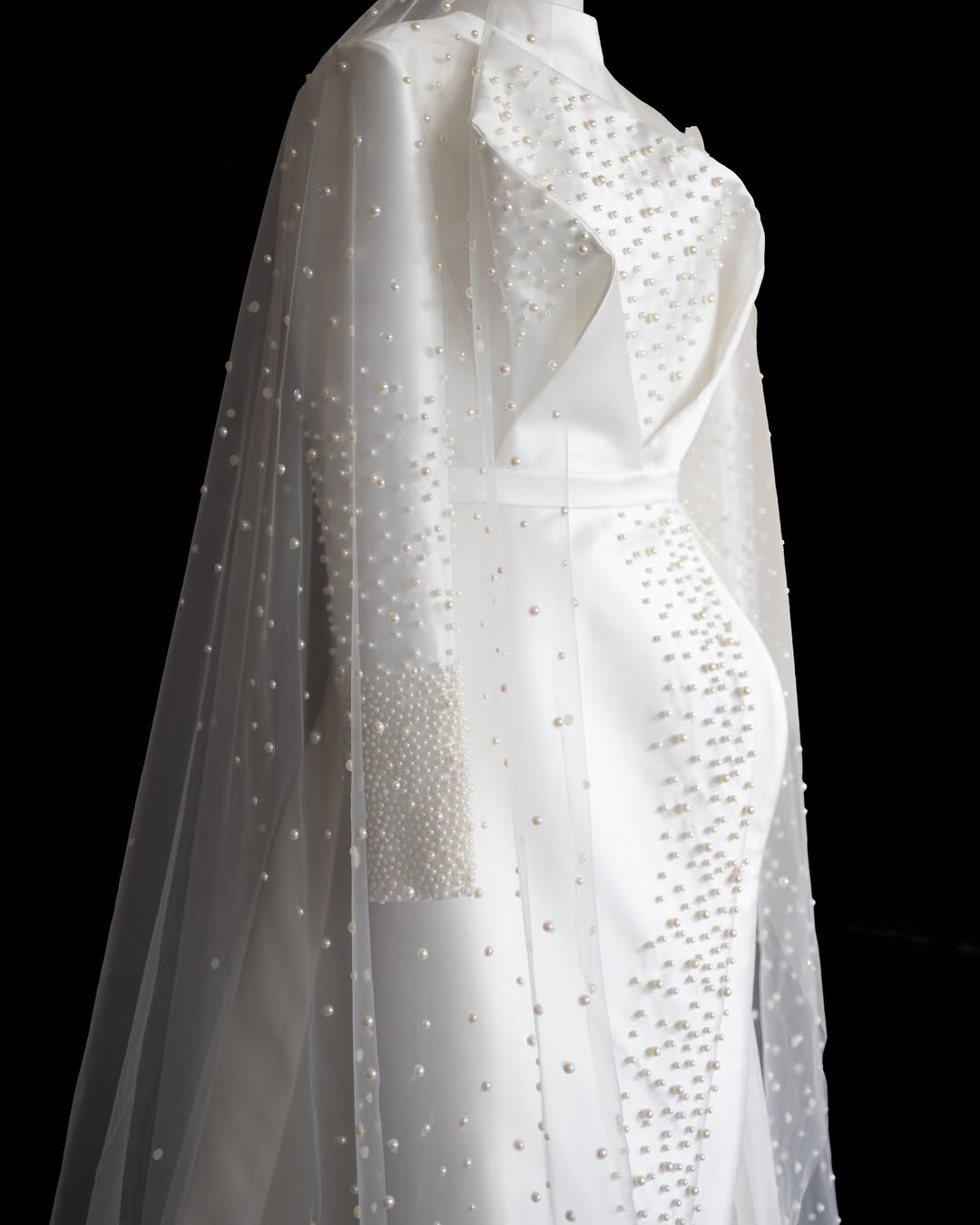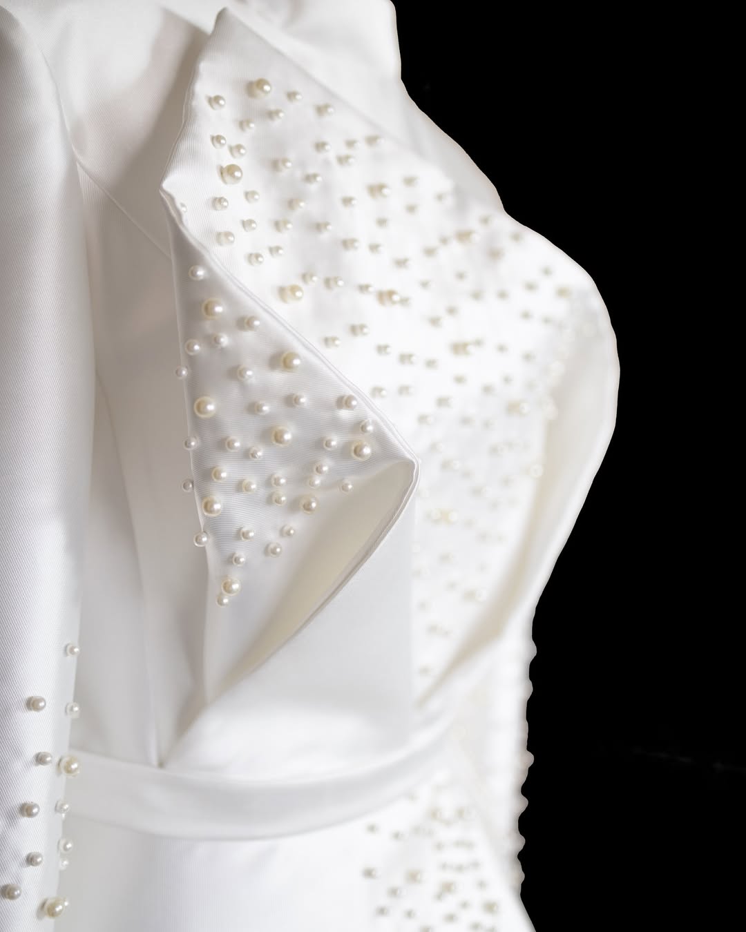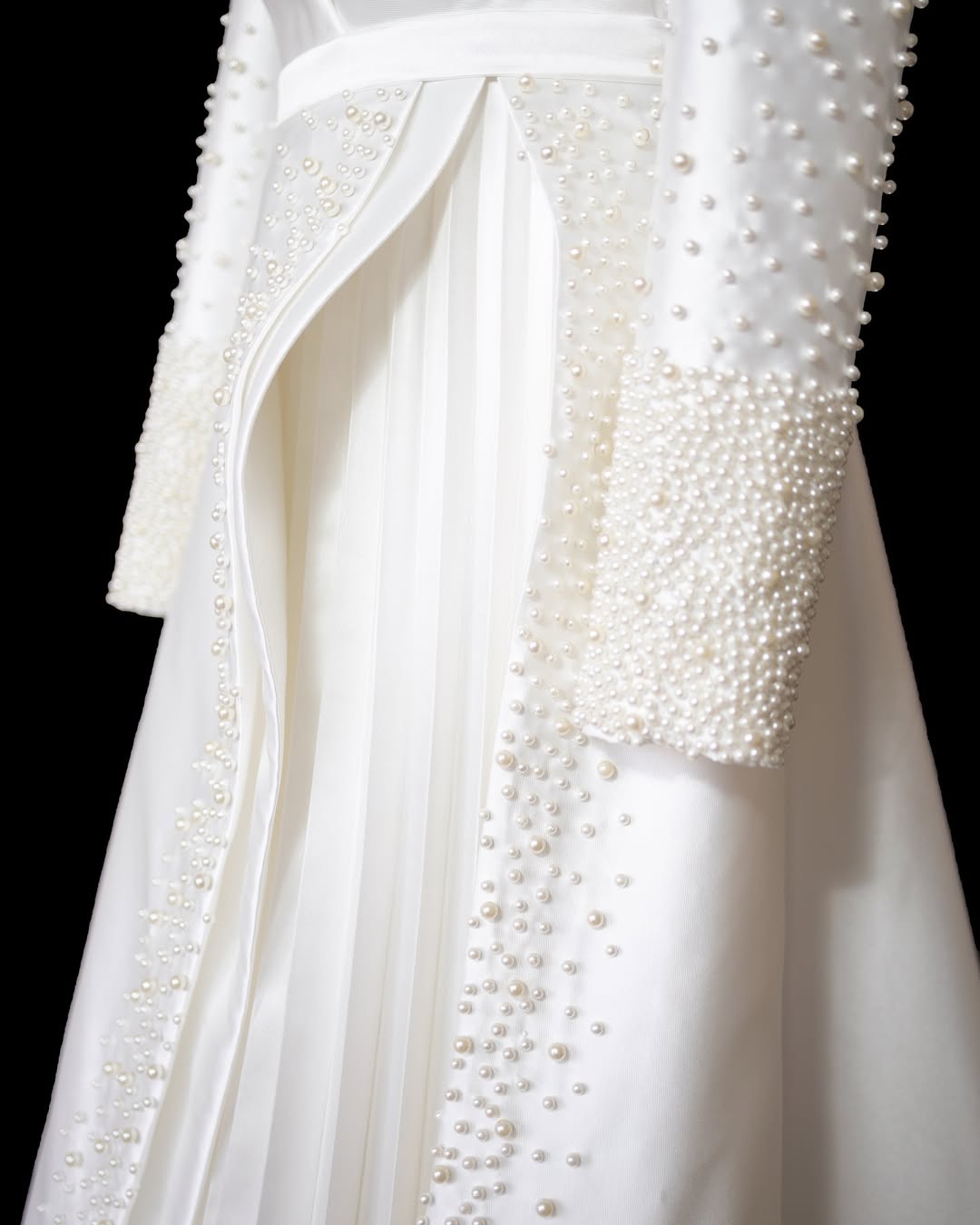 The bodice is sculpted through refined moulage techniques, creating an architectural interplay of folds and curves. Beneath the pearl-covered panels, soft plissé detailing adds depth, movement, and graceful fluidity.