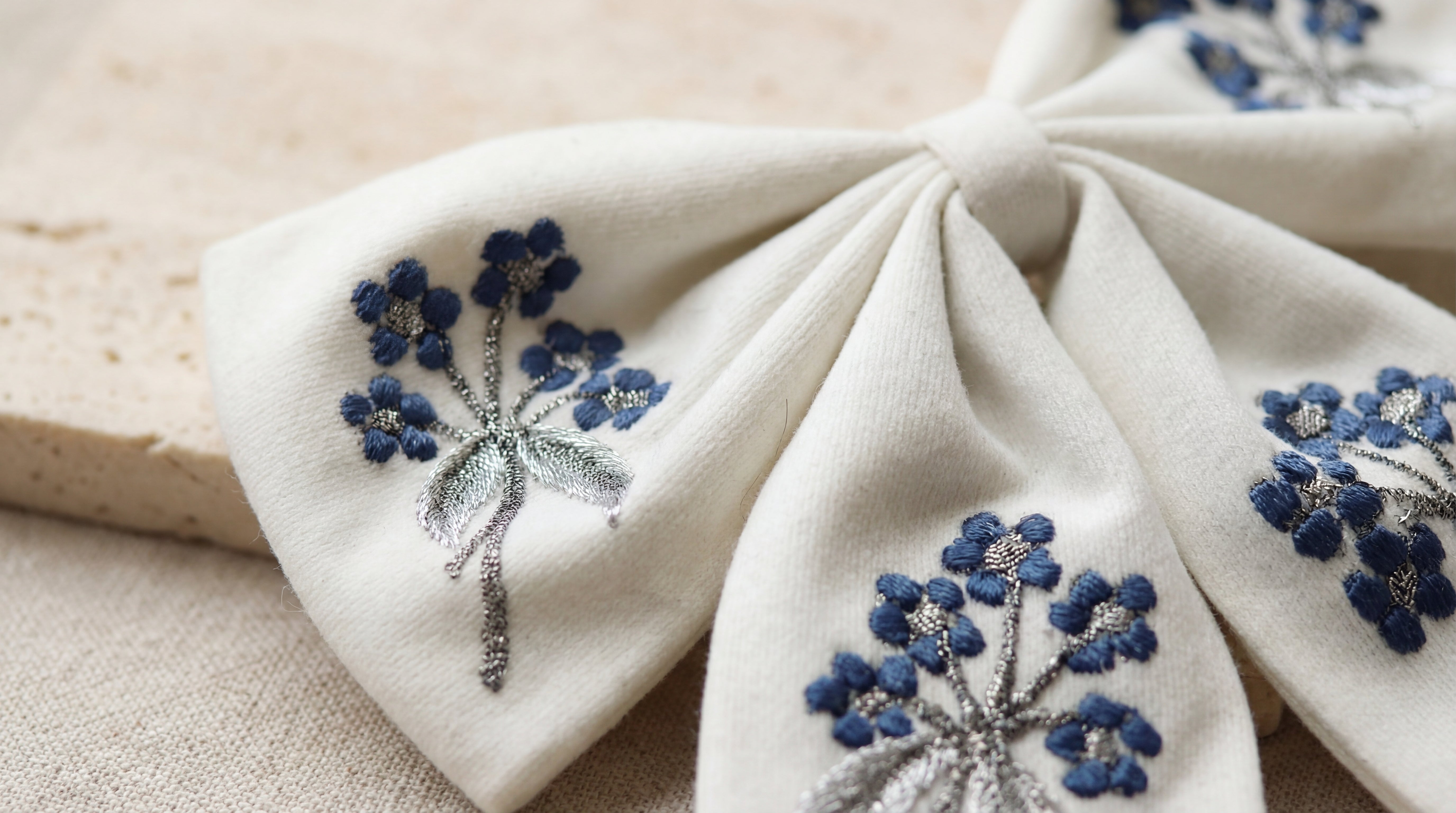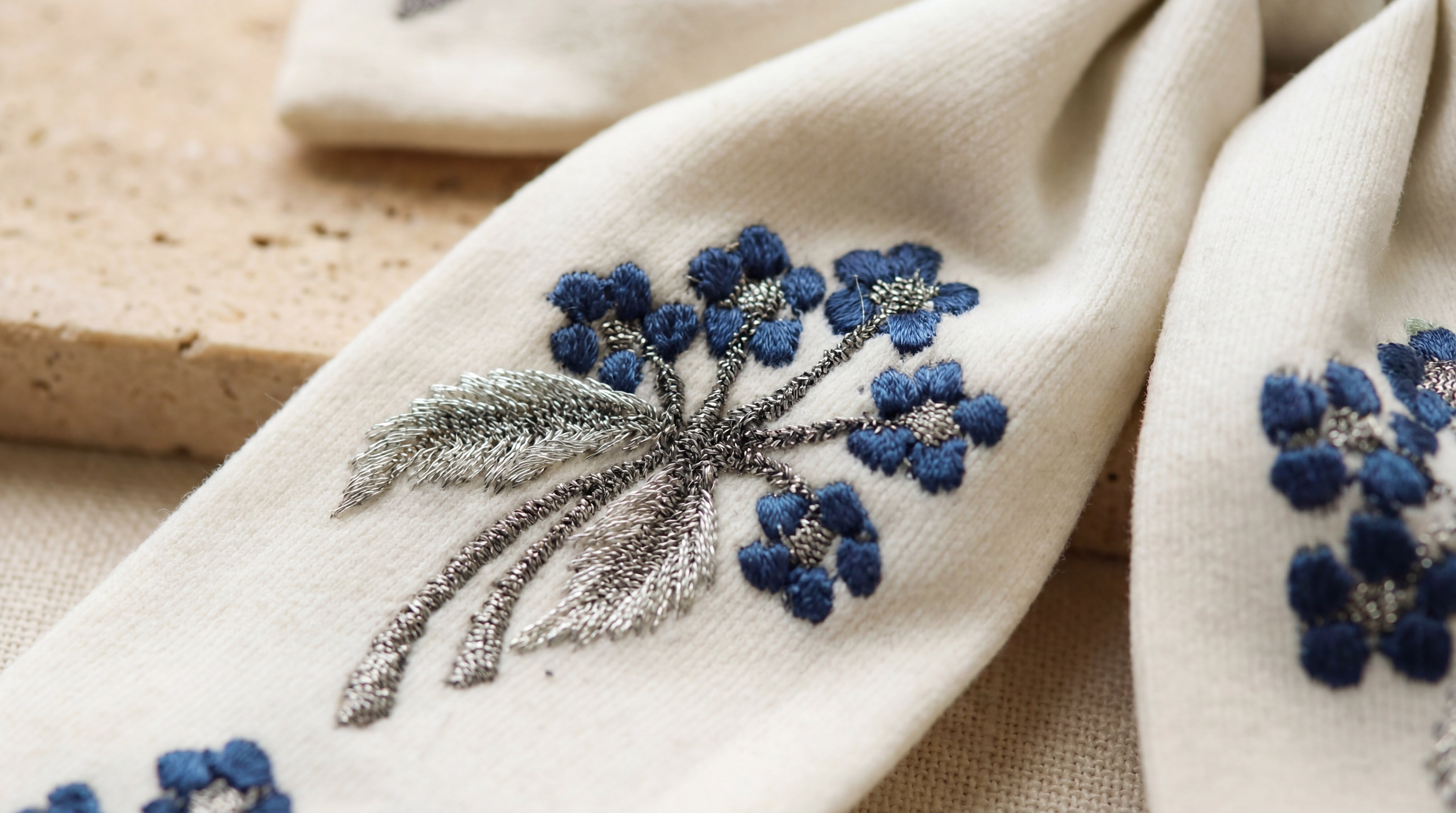 Soft ivory fabric adorned with delicate lilac blooms, each petal fully hand embroidered. Silver leaves add a subtle shimmer, creating a refined and feminine feel. Romantic, timeless, and made for the woman who carries her softness with quiet confidence.