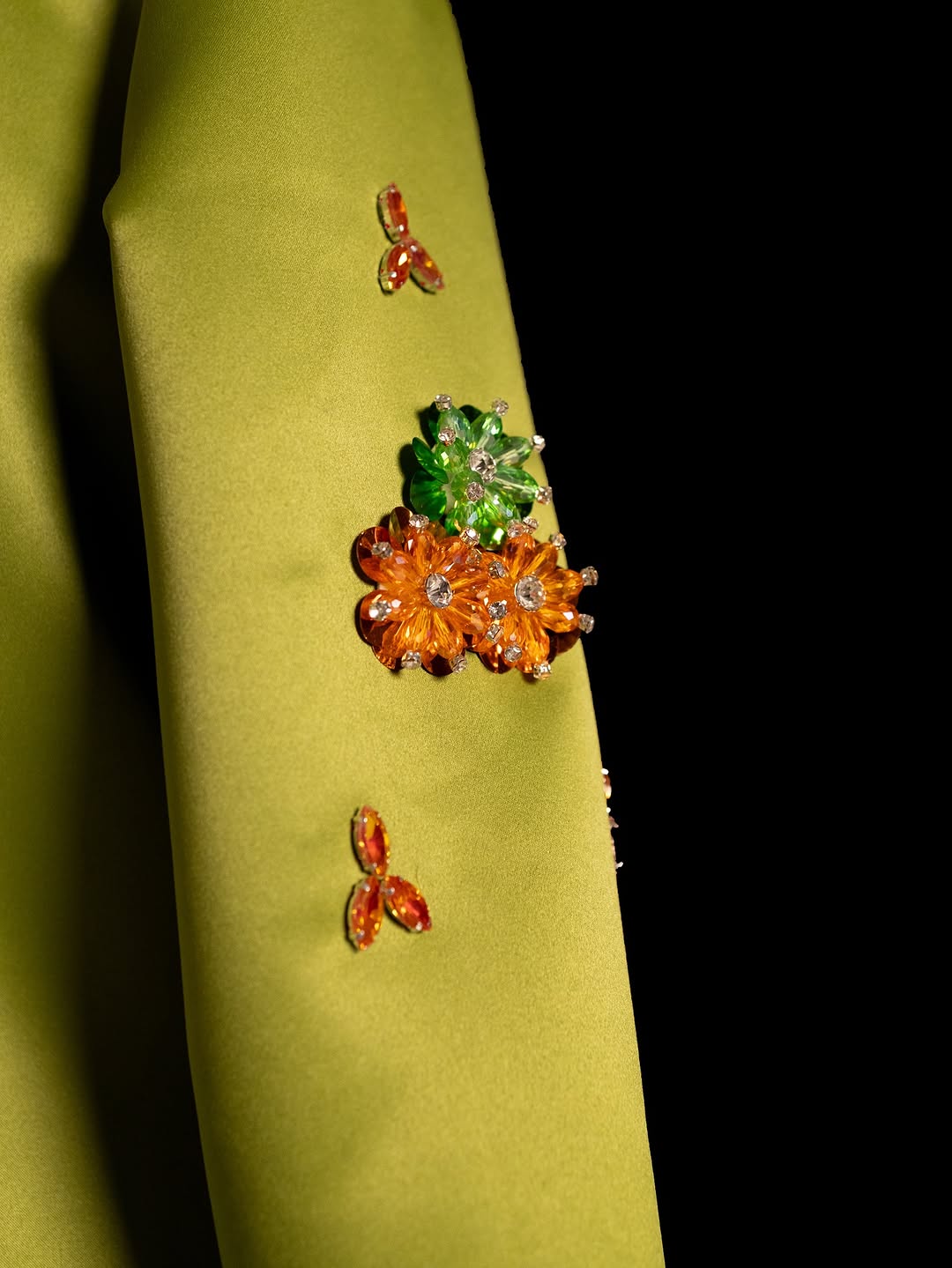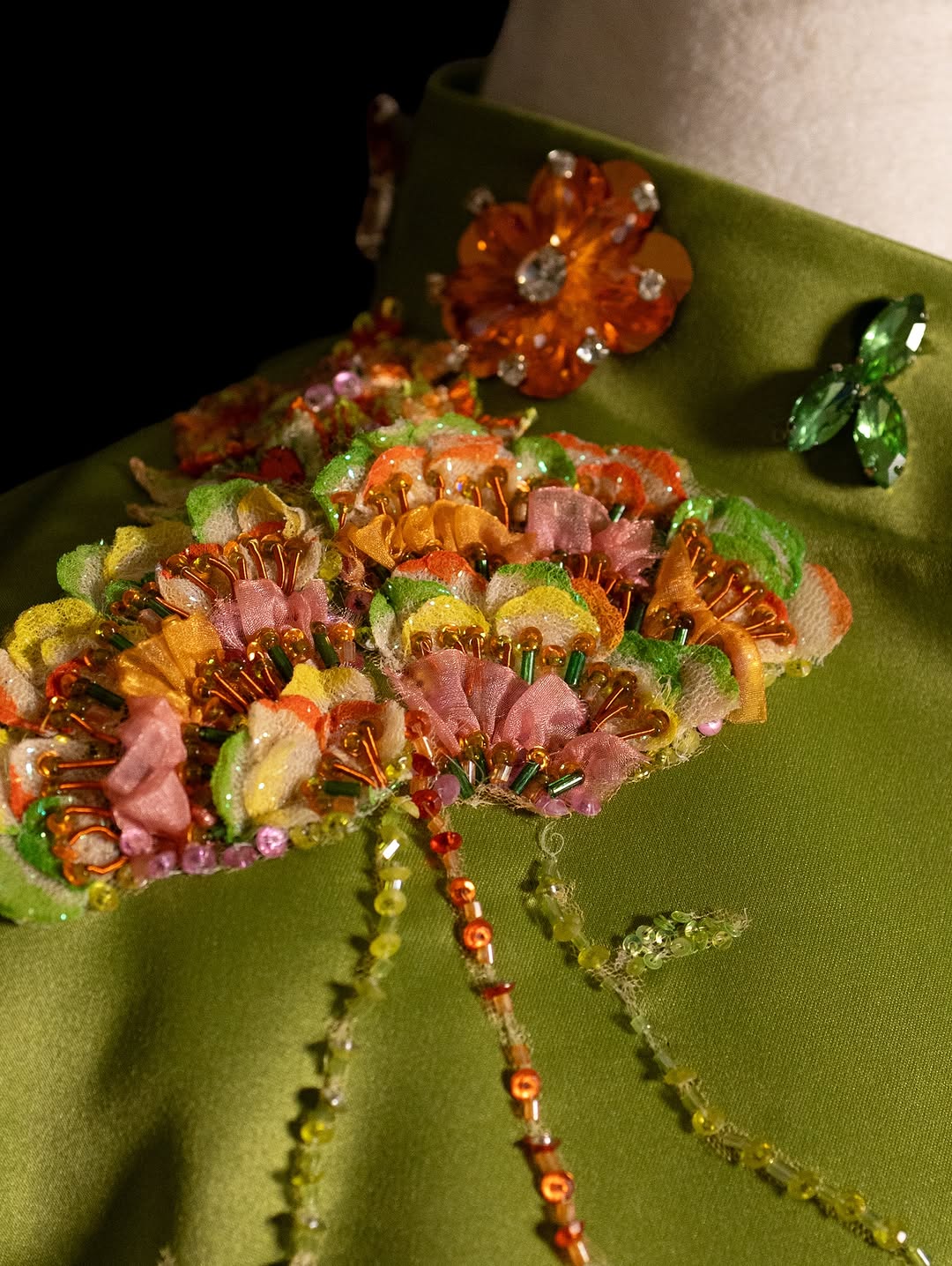 A luxurious green abaya adorned with vibrant handcrafted floral details—each bloom brought to life through meticulous Indian noul beadwork. The embroidery dances across the abaya in lively colors, creating a refined visual harmony that celebrates craftsmanship and femininity.