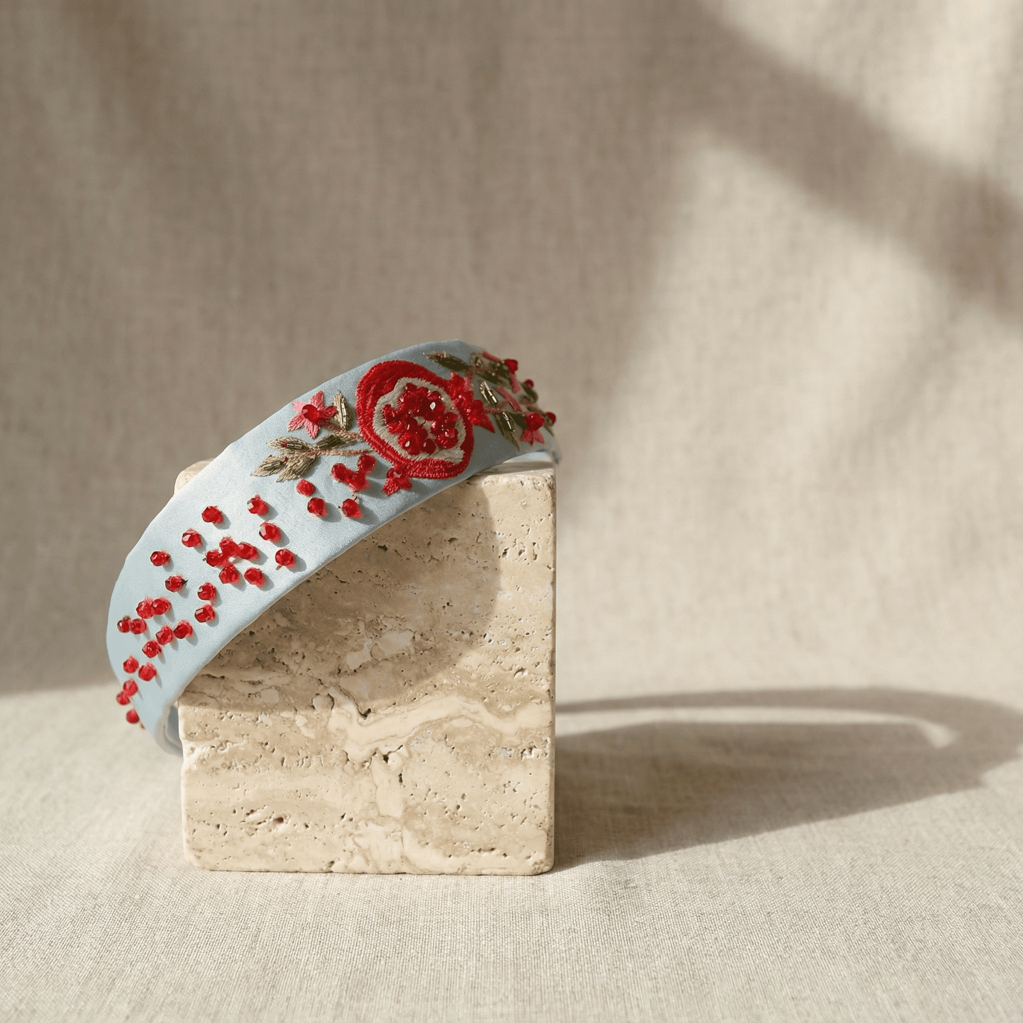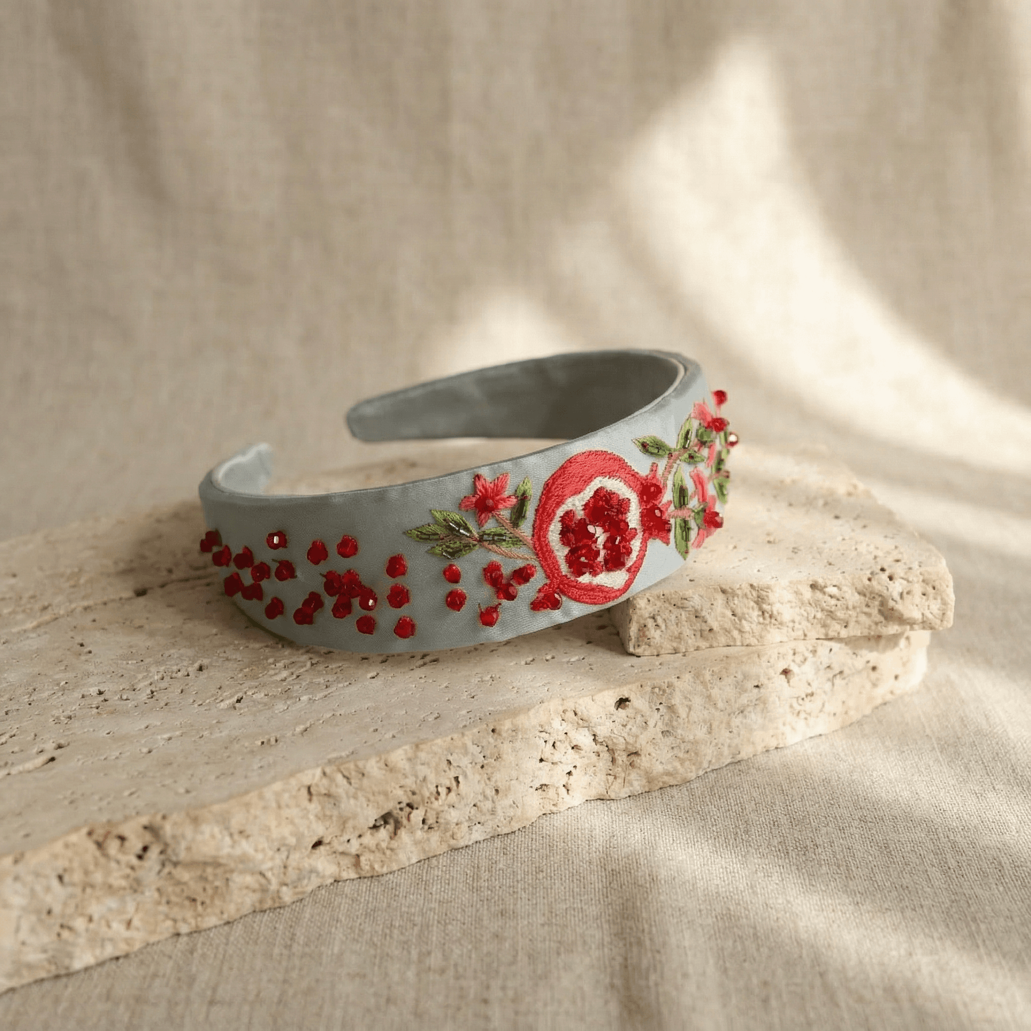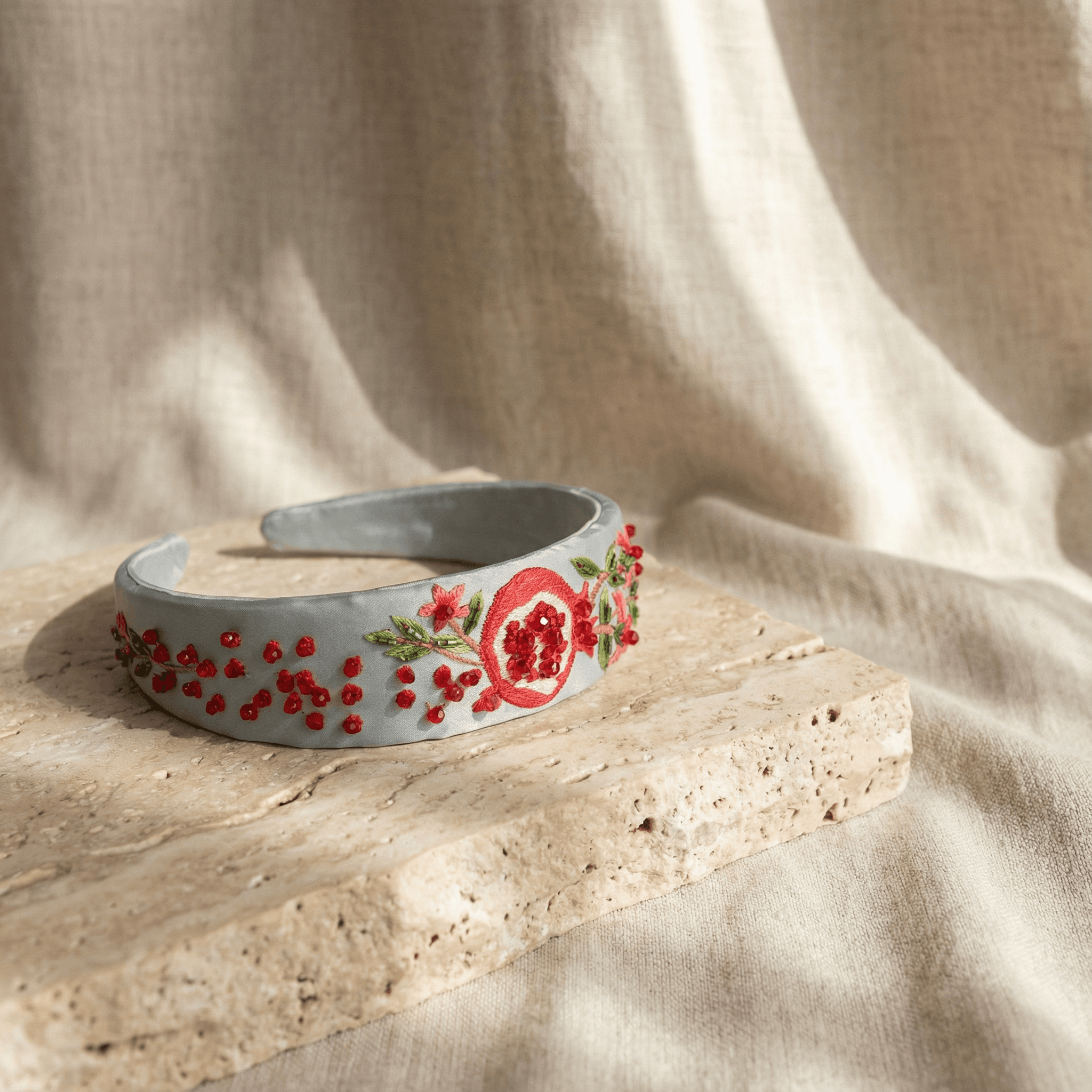 This elegant headband features meticulously crafted pomegranate motifs brought to life with fine hand-finished detailing, making it a striking accessory that blends heritage with modern refinement.