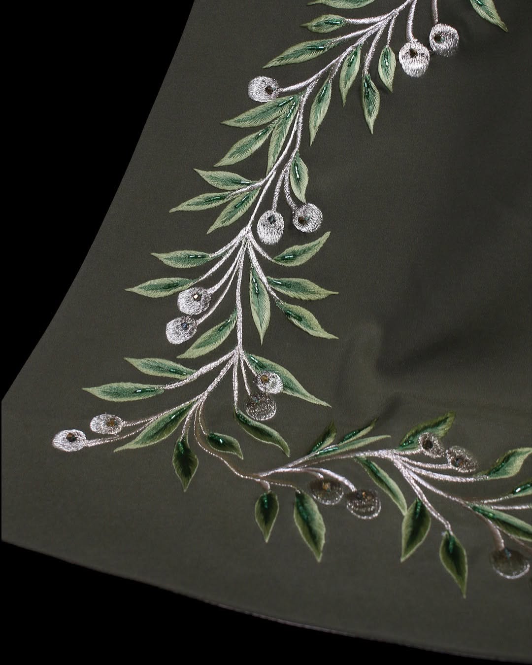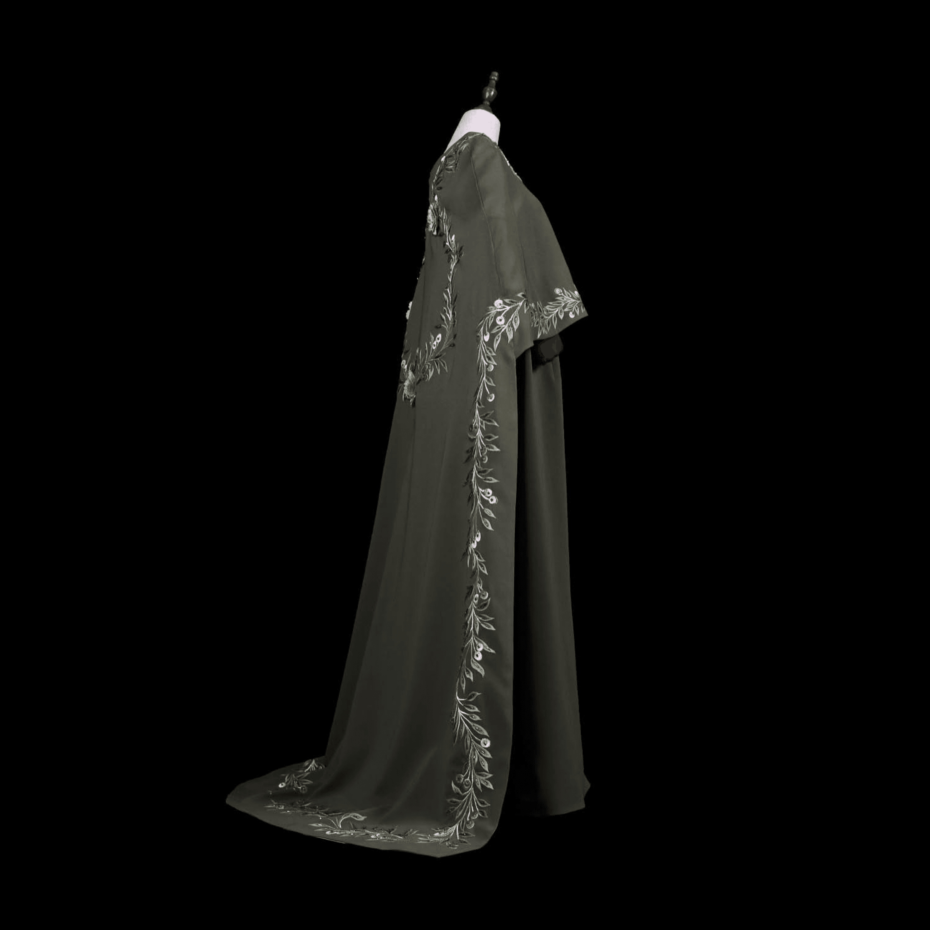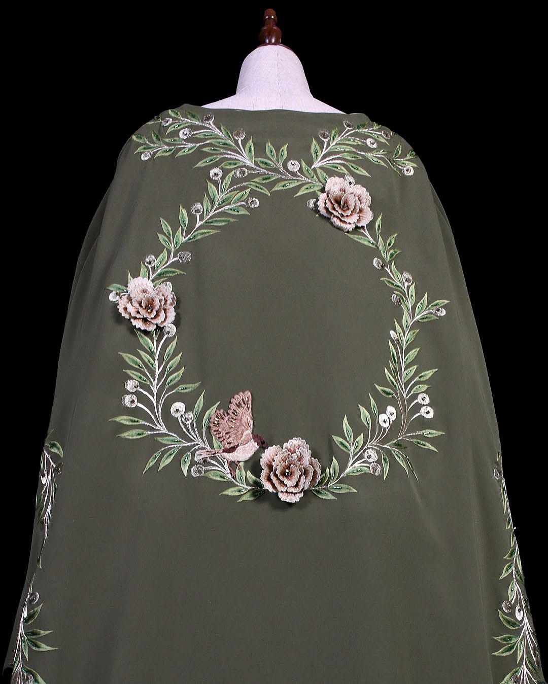 A distinguished couture piece honoring Gaza’s enduring spirit, adorned with hand-embroidered olive branches, Gaza’s iconic carnation flower, and the soulful bulbul bird—each detail echoing resilience and identity in quiet, powerful elegance.