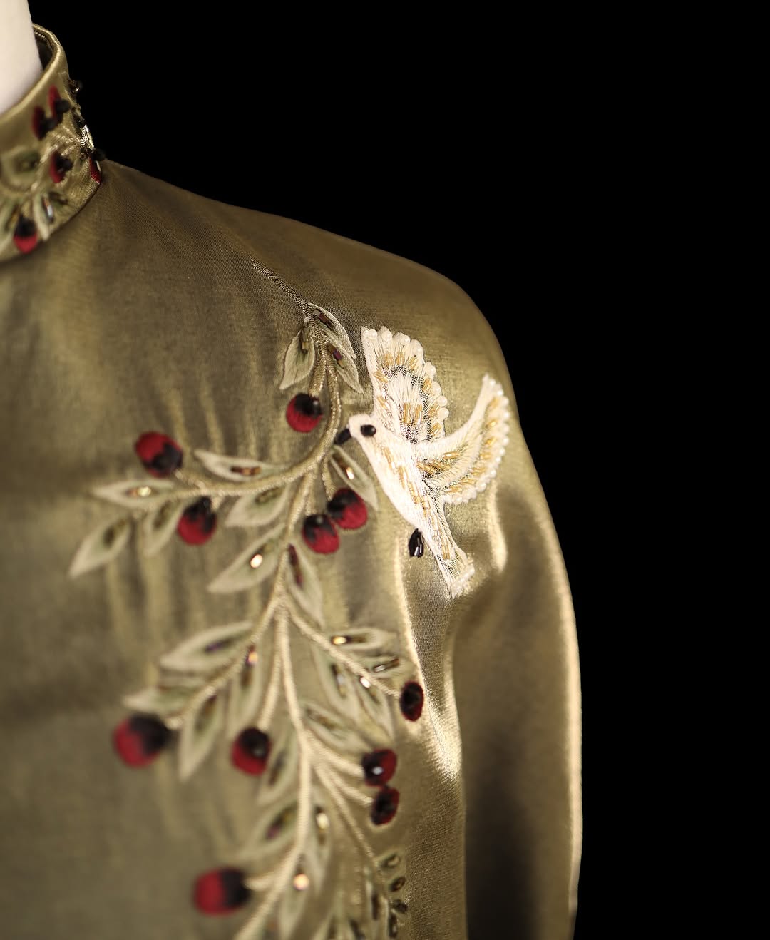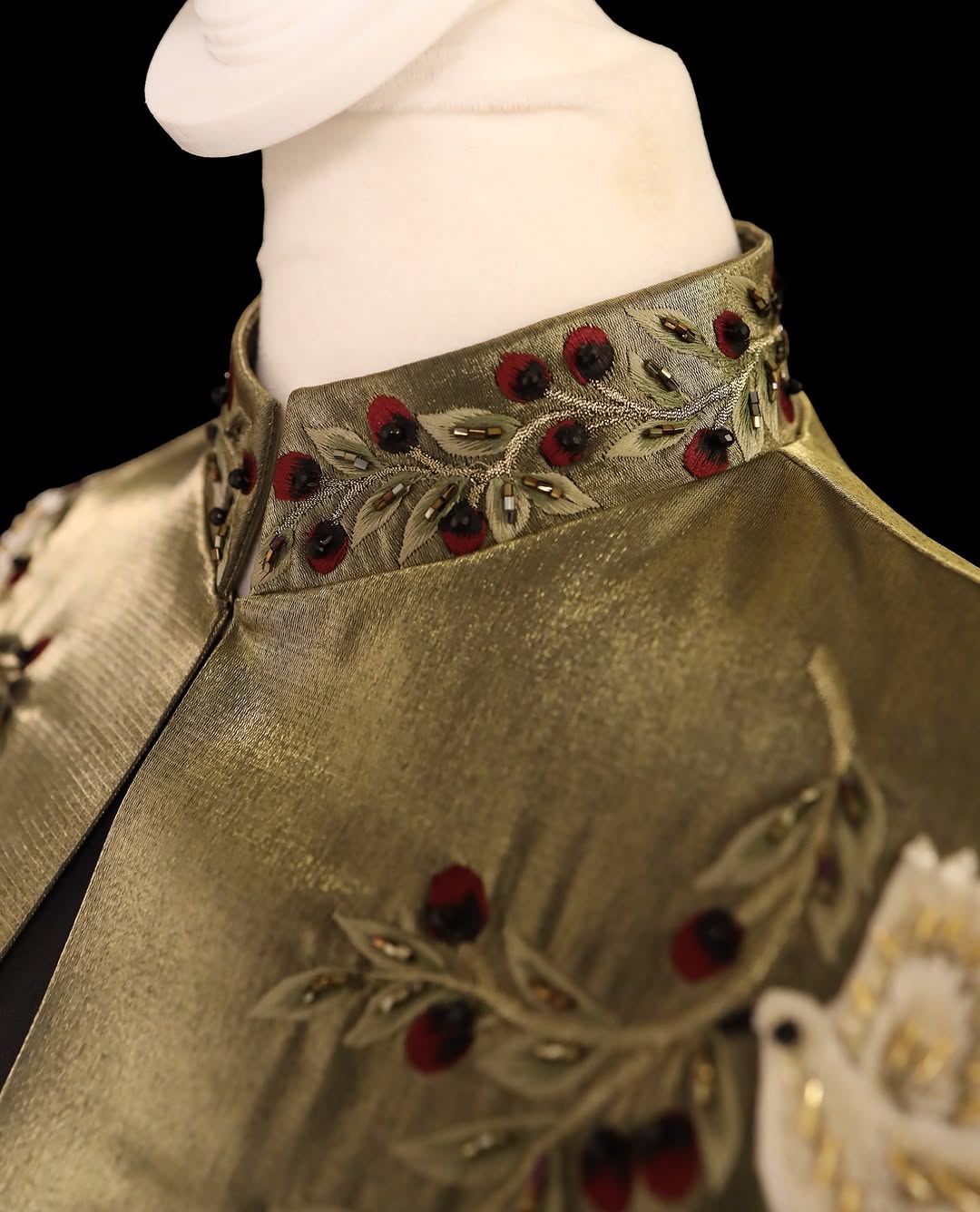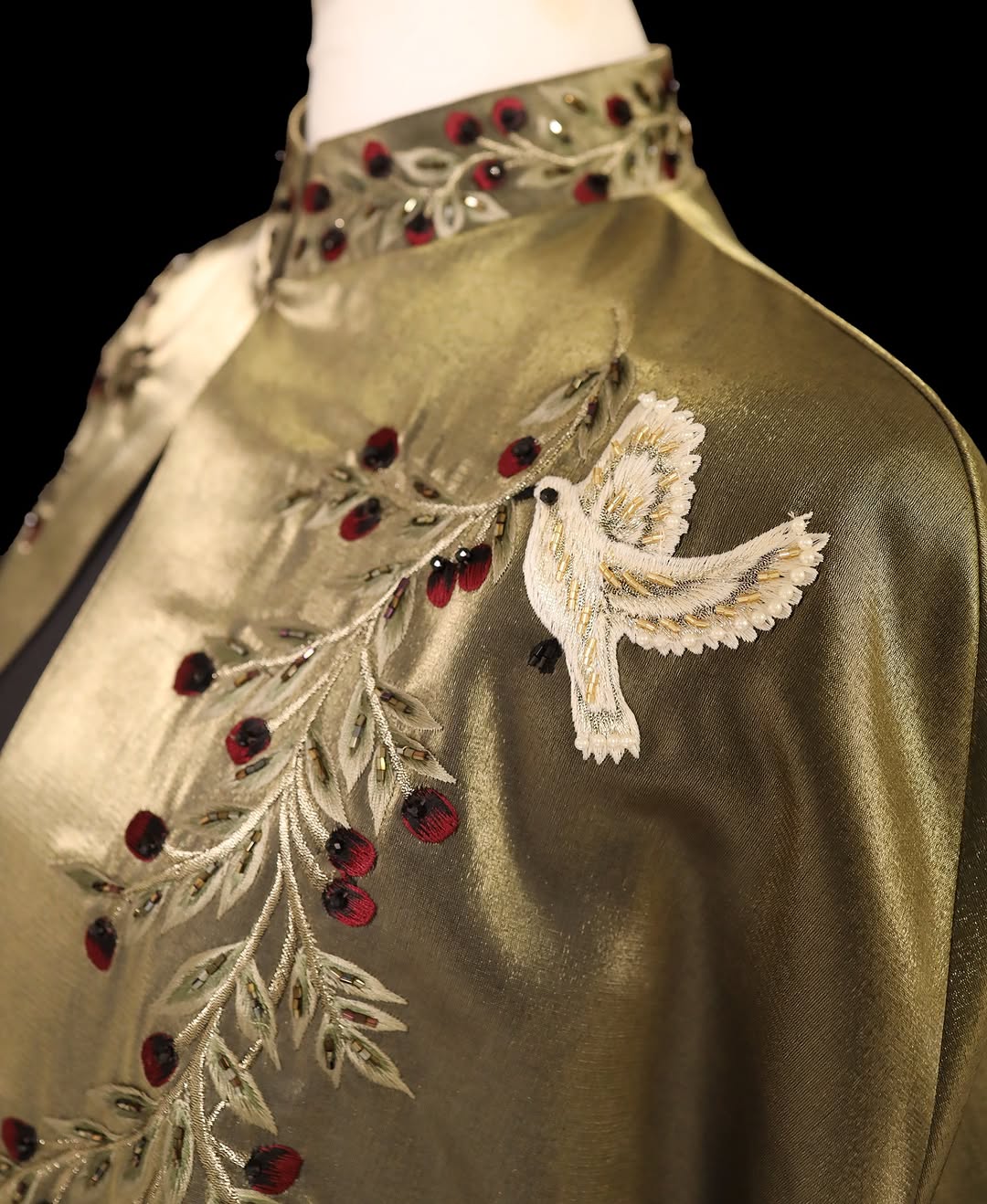 A luxurious couture cape adorned with hand-embroidered olive branches and peace doves using the artisanal Bratto technique, symbolizing Palestine’s resilience and hope. Paired with a flowing chiffon gown and a handcrafted belt, the piece blends heritage, serenity, and refined craftsmanship in a timeless silhouette.