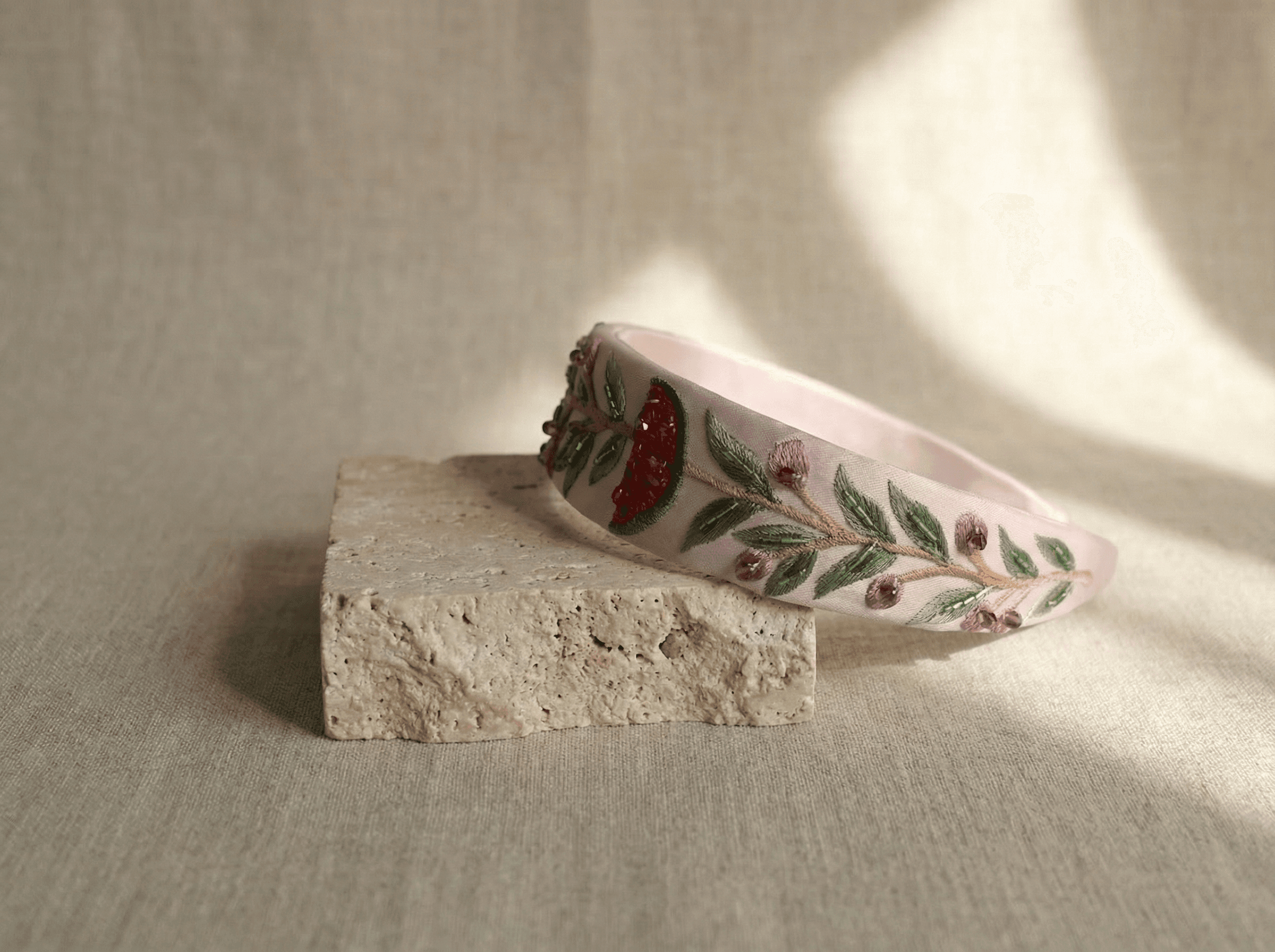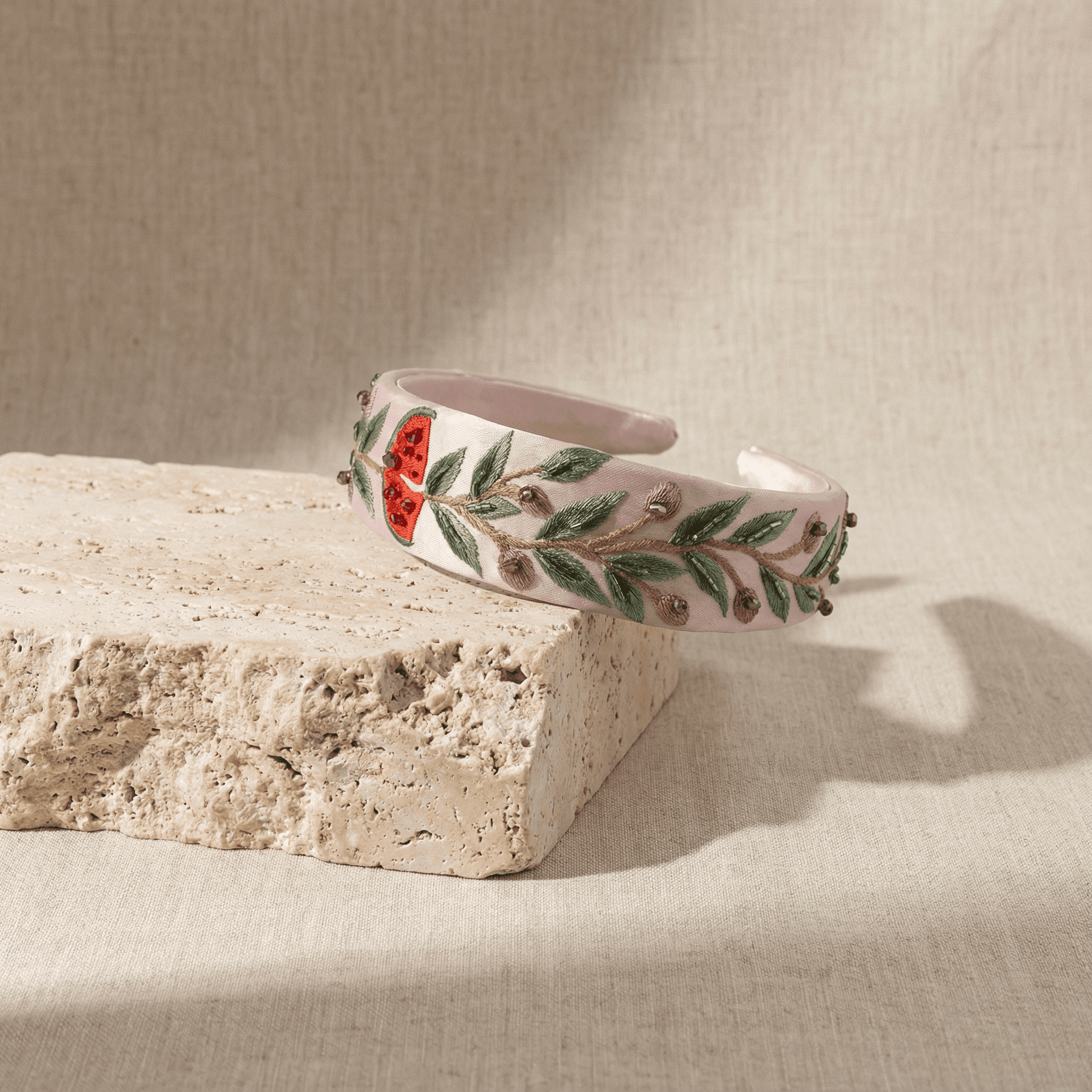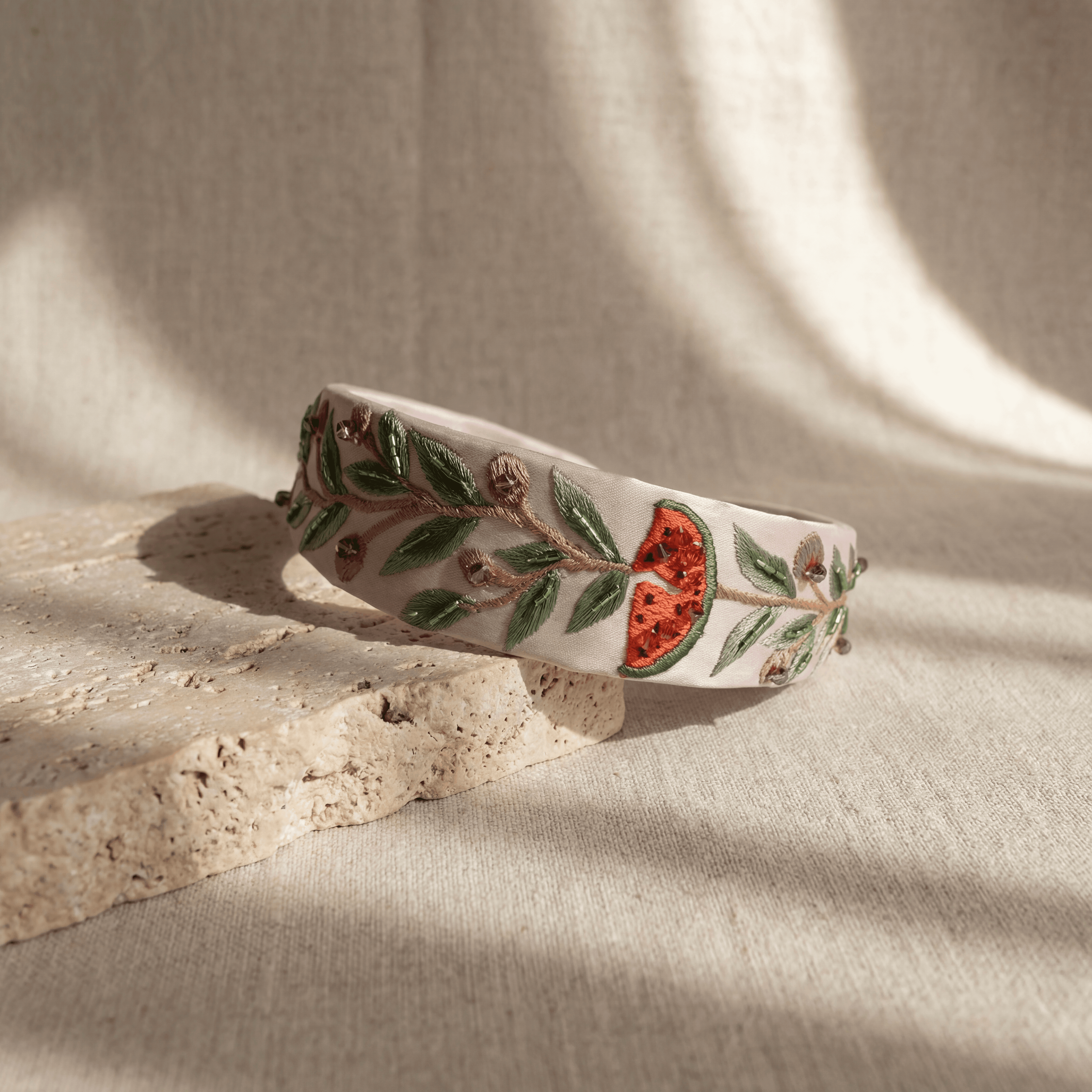 Watermelon-olives headbandnspired by the symbolism of Palestinian watermelon and olives, this handcrafted headband celebrates resilience and heritage through refined, artistic embroidery. A delicate yet powerful accessory that brings cultural elegance to every look.