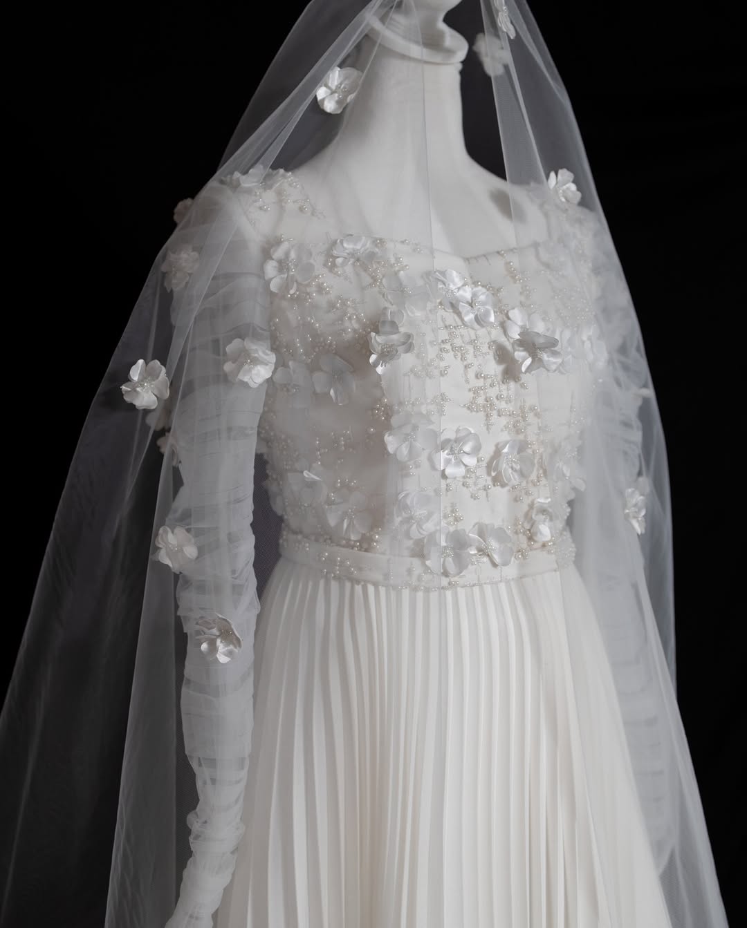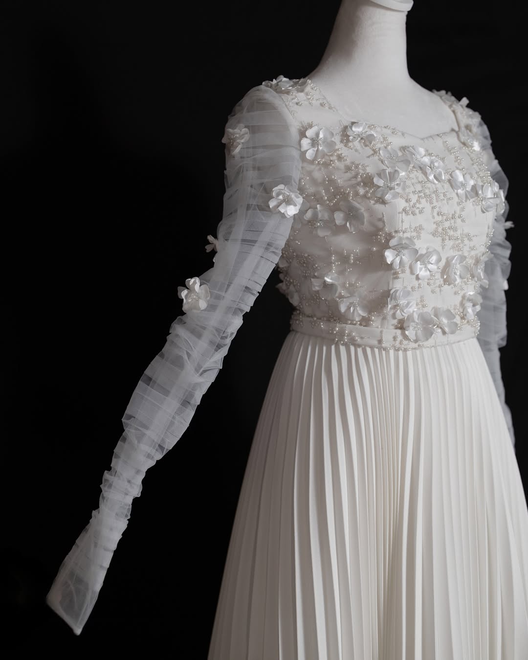 Hand-crafted with exquisite 3D floral appliqués, luminous pearls, and fine silk threads, this gown is a study in refined artistry. Draped tulle sleeves flow into a meticulously pleated skirt, shaping an elegant and poetic silhouette—created for the woman of grace and quiet sophistication.